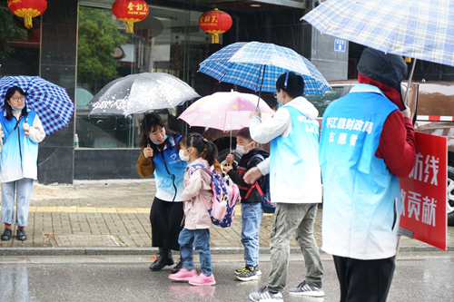 身穿蓝色马甲的财政局志愿者在学校门口及周边3个十字路口维护秩序,背影在大雨中显得格外醒目,得到了学校和广大家长的一致认可和称赞。