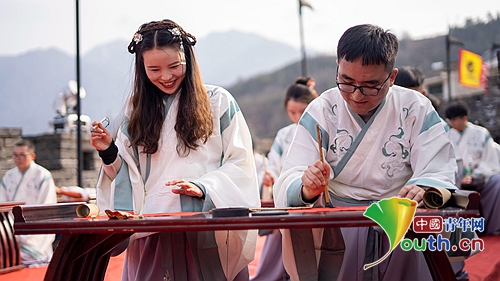 活动在金声迎祥中拉开了序幕,百余名参与者身着汉服,从学习汉文化传统礼仪开始。一名男生和一名女生组队,共同参与“穿汉服、行汉礼”“木犊传情”“射以观德”“飞花传情”“雅歌投壶”“国风汉韵”“赏习茶艺”“茶乐青溪”等一系列趣味互动游戏。