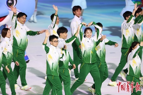 11月5日,广西南宁,第一届全国学生(青年)运动会开幕式上,澳门特别行政区代表团入场,一名运动员向观众摆出“比心”动作。当晚,第一届全国学生(青年)运动会开幕式在广西体育中心体育场举行,由省(区、市)代表团,香港、澳门特别行政区,新疆生产建设兵团,以及城市代表团组成的101个参赛代表团依次登上舞台,展现青春风采。中青报·中青网记者 曲俊燕/摄