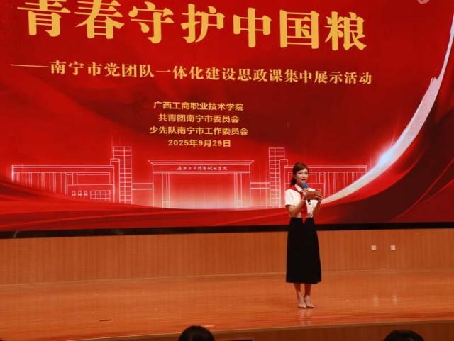 中国青年报客户端讯(中青报·中青网记者 谢洋)9月29日上午,“青春守护中国粮” 南宁市党团队一体化建设思政课集中展示活动在广西工商职业技术学院举办。本次活动由共青团南宁市委、南宁市少工委联合广西工商职业技术学院共同主办,旨在探索党团队一体化思政育人新模式,强化青少年粮食安全意识。