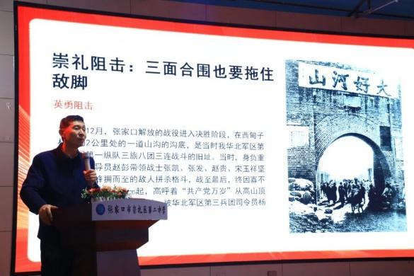 张家口市委讲师团讲师党宁以《红色之城,英烈忠魂筑丰碑》为题,结合张家口市的地理环境和历史遗迹,讲述吉鸿昌、武士敏、马宝玉、董存瑞以及西甸子五勇士等与张家口相关的英雄事迹,引导学生在“家门口”的红色资源中了解革命历史,增强爱国情感。