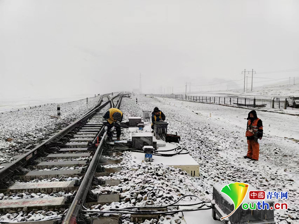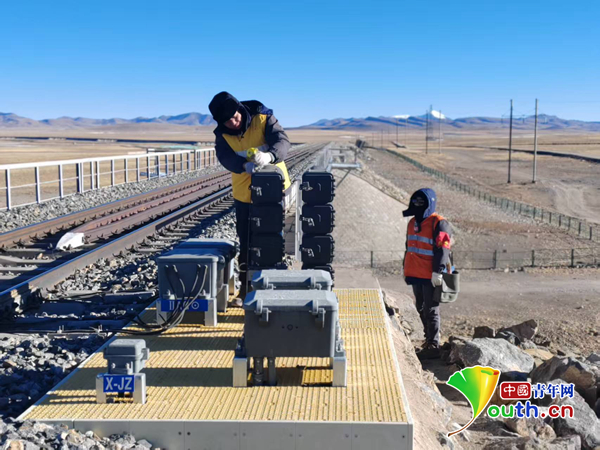 拉萨基础设施段扎加藏布信号工区职工对道岔融雪设备进行检修。中国青年网通讯员 王富生 供图
