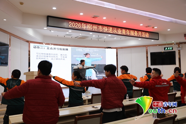 柳州市中医医院康复医学科医生麻广波带领快递从业人员跳八段锦。团柳州市委 供图