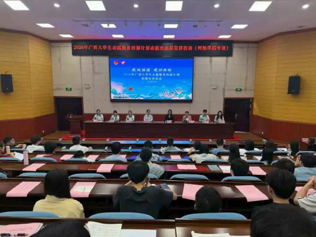 近日,2026年广西大学生志愿服务西部计划招募宣讲活动于在河池学院举行。5名西部计划志愿者分享在基层一线收获成长的实践故事,号召青年学子到西部去、到基层去,以实干报效祖国。