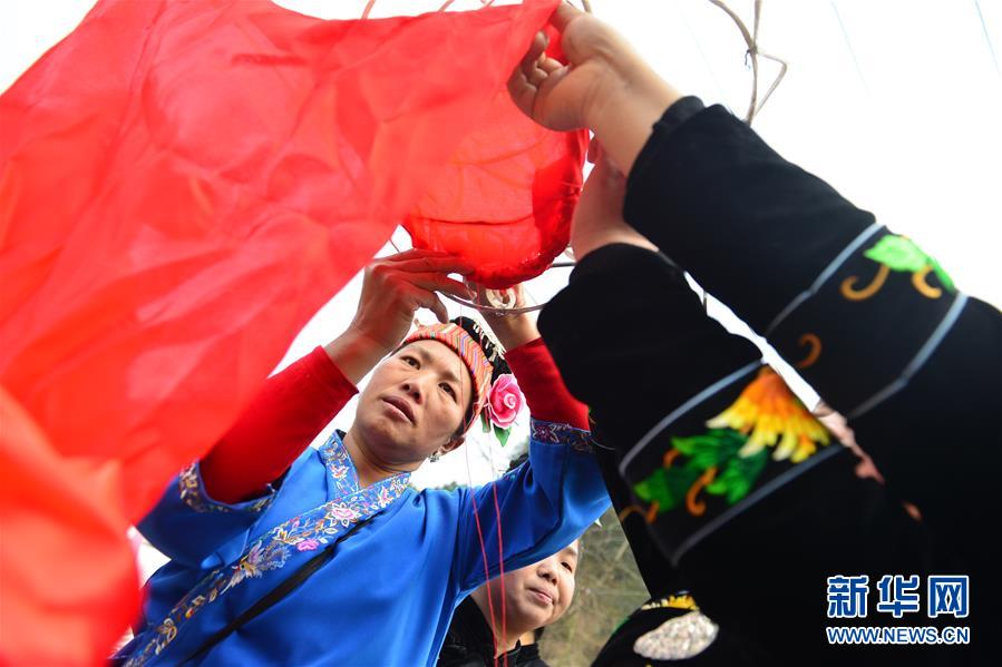 2月25日,在贵州省台江县抬拱街道温泉村大德苗寨,村民在缝制彩龙的龙头。新华社发(杨文斌 摄)
