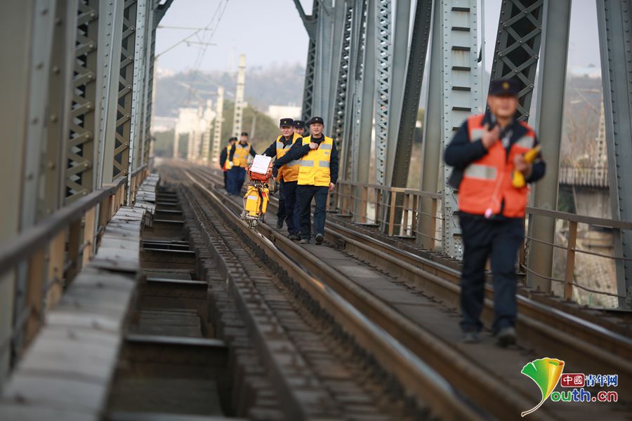 铁路探伤工对桥梁上的钢轨进行探测,每次作业,探伤工要推着仪器在钢轨上走10公里。中国青年网通讯员 苏志刚 摄