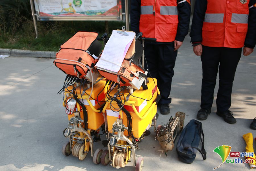 两台各50公斤重的国产钢轨探伤仪,每台需要两人操作。中国青年网通讯员 苏志刚 摄