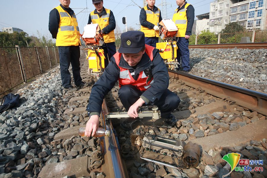 探伤工结合探测仪给出的信号在对铁轨上的一处疑似伤进行仔细检查。中国青年网通讯员 苏志刚 摄
