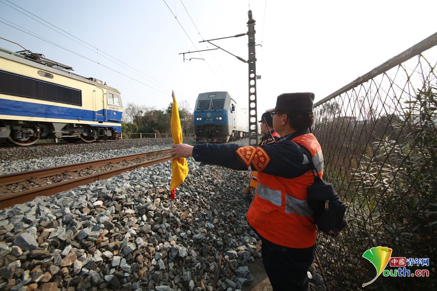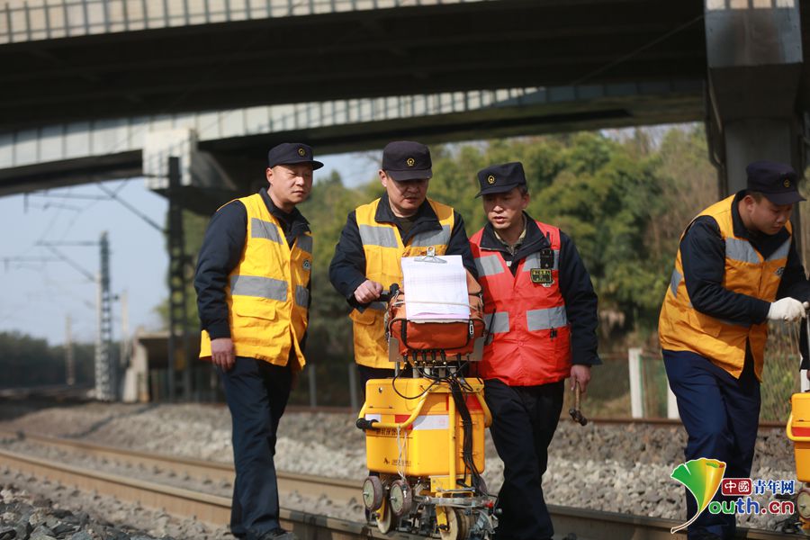 由于是在白天作业,探伤组员们要随时根据安全防护员的提示避让列车。中国青年网通讯员 苏志刚 摄
