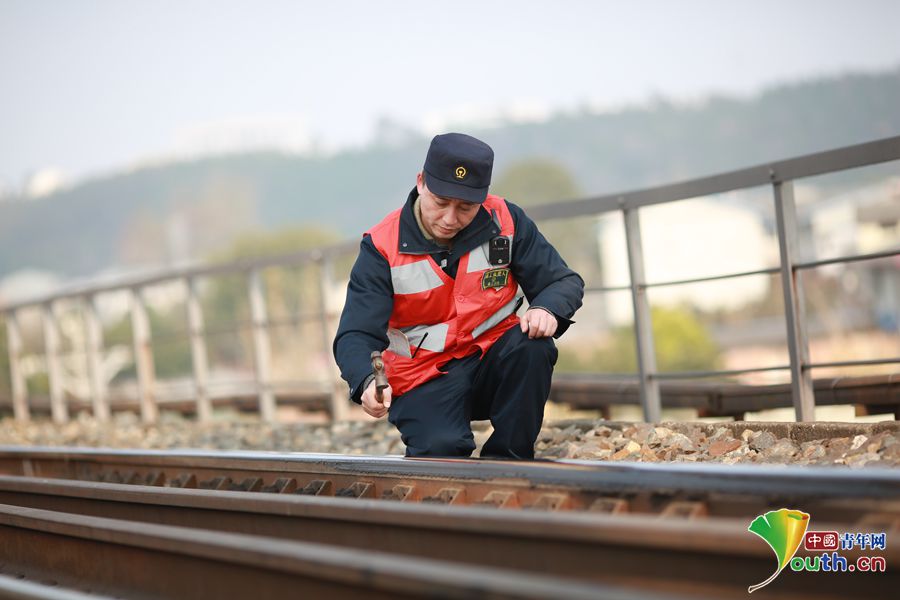 据介绍,安少彬和工友每次作业大约要走10公里,一趟下来要8个小时。春运期间,过往的列车明显增多,近百斤的探伤仪器每天须提上提下几百次,遇到铁轨焊缝接头,须一天弯腰上百次。