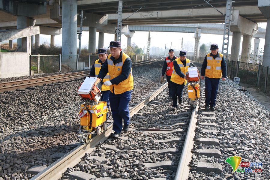 铁路探伤工饮风沐雪、穿越四季,用脚板丈量着每一寸钢轨,“责尽心安,共保安全”就是铁路探伤工的梦想。中国青年网通讯员 苏志刚 摄