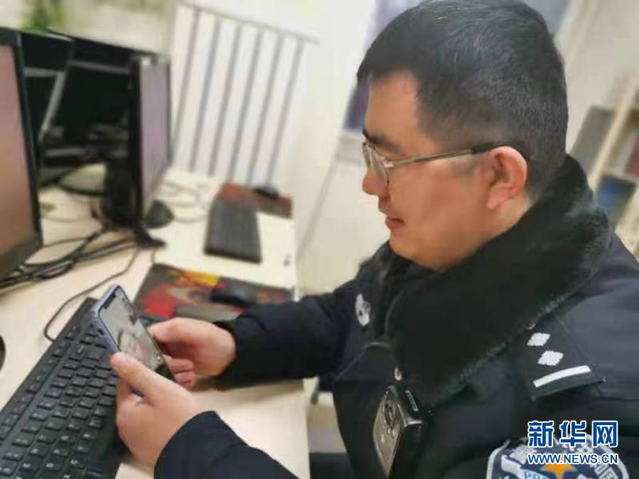 北京市公安局朝阳分局劲松派出所民警潘磊跟远在安徽的家人视频(2月9日摄)。新华社发(北京市公安局朝阳分局供图)
