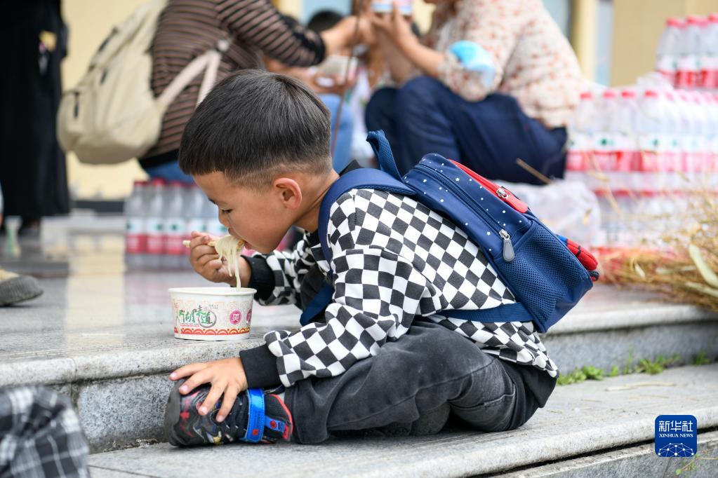 9月6日,在位于石棉县王岗坪乡挖角村村委会的安置点,一名小朋友在吃午饭。