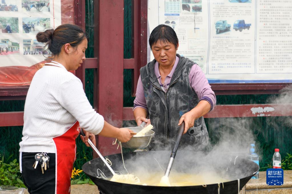 当日,在位于四川省雅安市石棉县王岗坪乡挖角村村委会的安置点,村民在安置点内架起锅灶,生火做饭,为安置点里的邻里乡亲准备餐食。