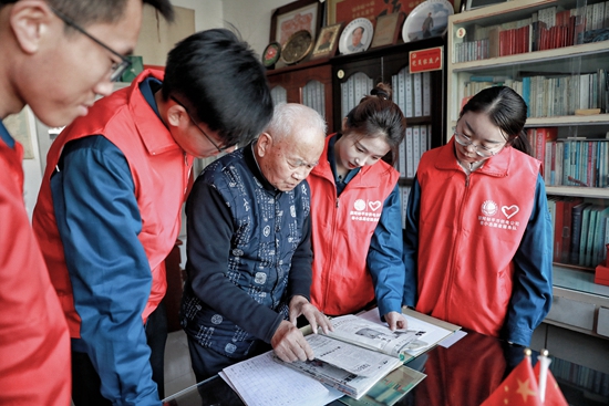 近日,国家电网山东省邹平市供电公司团委组织青年志愿者员工,走访当地90岁的模范党员、全国先进工作者刘继唐,聆听党史故事,阅读珍贵老档案,亲身感受党的初心使命和红色传承。韩昊东/摄