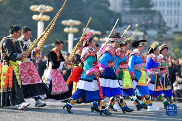 当日是正月初九,贵州省黔南布依族苗族自治州龙里县举办传统民俗“踩街”活动,通过花灯巡演、花棍舞、芦笙舞、舞龙舞狮等民俗活动,欢度新春。