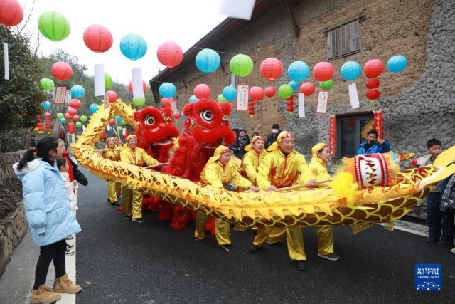 2月5日,在浙江省杭州市临安区天目山镇“天目月乡”村落景区,游客在观看舞龙、舞狮表演。