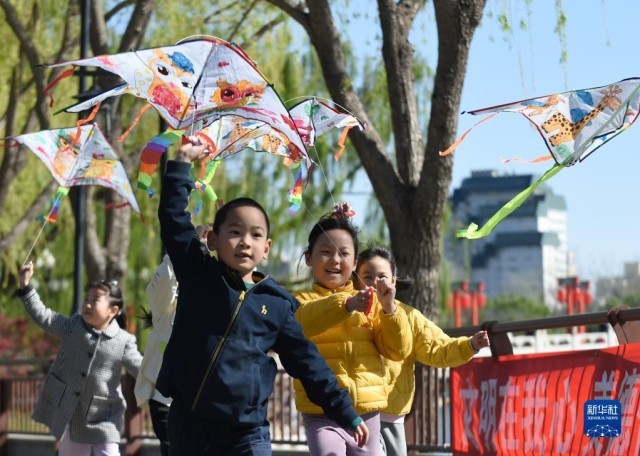4月7日,小朋友在北京陶然亭公园放风筝。