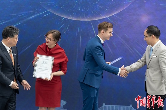 4月12日,北京凤凰中心,曾获“匈牙利最具潜力青年50人”称号的郝雁清(左三)、百安木设计咨询(北京)有限公司公关和市场经理贺晓晴(左二)受聘为国际青年北京论坛青年友谊使者。当日,由当代中国与世界研究院和北京市人民政府新闻办公室主办的第二届国际青年北京论坛举行。中青报·中青网记者 李隽辉/摄