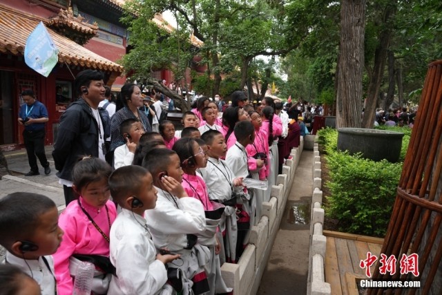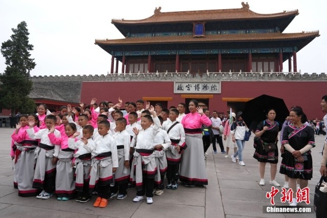5月31日,“三江源·北京情·中国心——青海玉树藏族青少年北京行”公益活动正式启动。来自青海省玉树藏族自治州儿童福利院的40名藏族青少年参观游览了故宫、鸟巢和水立方。图为孩子们在故宫神武门外合影吸引了一旁来自广西的仫佬族游客的关注。
