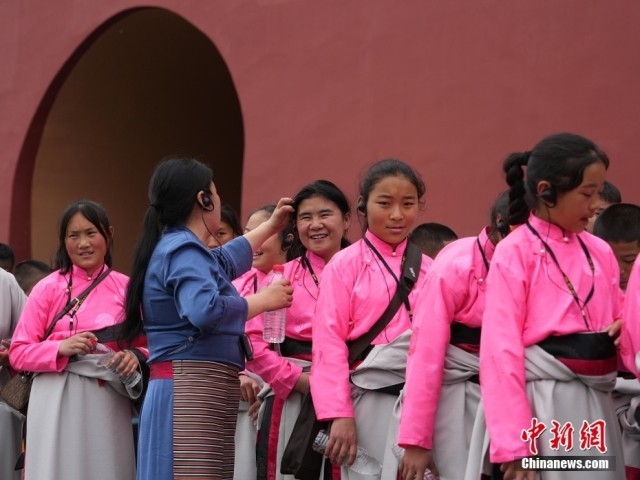 5月31日,“三江源·北京情·中国心——青海玉树藏族青少年北京行”公益活动正式启动。来自青海省玉树藏族自治州儿童福利院的40名藏族青少年参观游览了故宫、鸟巢和水立方。图为玉树州儿童福利院老师才代吉在给13岁的女孩索南拉吉整理头发。