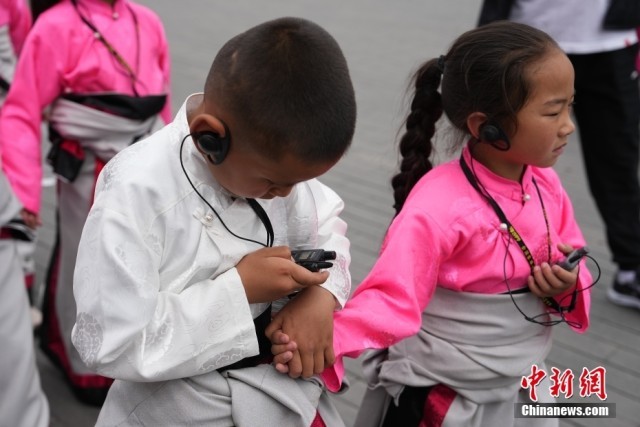 5月31日,“三江源·北京情·中国心——青海玉树藏族青少年北京行”公益活动正式启动。来自青海省玉树藏族自治州儿童福利院的40名藏族青少年参观游览了故宫、鸟巢和水立方。图为8岁的美德英(左)第一次戴耳机,他十分喜欢手中的这个讲解用的小机器。在故宫游览时,他不时就会低头摆弄它。