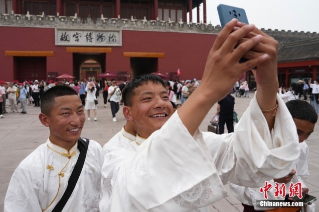 5月31日,“三江源·北京情·中国心——青海玉树藏族青少年北京行”公益活动正式启动。来自青海省玉树藏族自治州儿童福利院的40名藏族青少年参观游览了故宫、鸟巢和水立方。图为同为14岁的代增扎西(左)与乃美才仁(中)在故宫门前自拍留念。