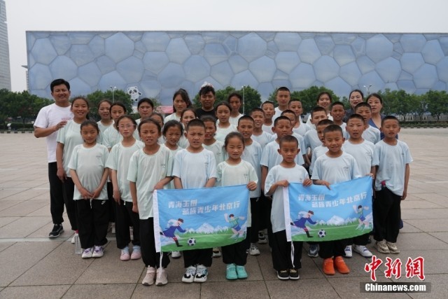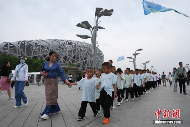 5月31日,“三江源·北京情·中国心——青海玉树藏族青少年北京行”公益活动正式启动。来自青海省玉树藏族自治州儿童福利院的40名藏族青少年参观游览了故宫、鸟巢和水立方。图为孩子们参观游览鸟巢和水立方。