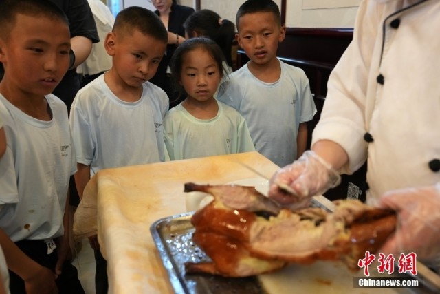 5月31日,“三江源·北京情·中国心——青海玉树藏族青少年北京行”公益活动正式启动。来自青海省玉树藏族自治州儿童福利院的40名藏族青少年参观游览了故宫、鸟巢和水立方。图为孩子们观看厨师制作北京烤鸭。