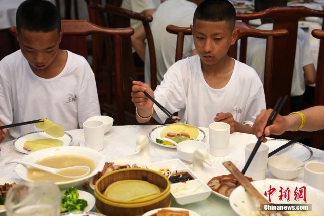 5月31日,“三江源·北京情·中国心——青海玉树藏族青少年北京行”公益活动正式启动。来自青海省玉树藏族自治州儿童福利院的40名藏族青少年参观游览了故宫、鸟巢和水立方。图为孩子们品尝北京烤鸭。