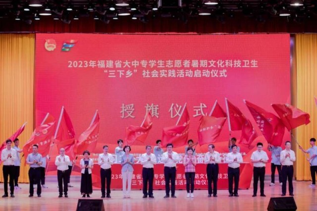 启动仪式上,参会嘉宾为福建各校“三下乡”专项活动代表团队授旗。(团福建省委供图)
