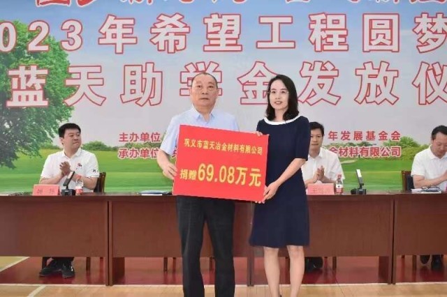 仪式上,巩义市蓝天冶金材料有限公司向河南省青少年发展基金会捐赠;团河南省委副书记王海萍向巩义市蓝天冶金材料有限公司颁发“希望工程爱心单位”牌匾;与会领导共同为受资助学生代表发放助学金。受资助新生代表张诗言在发言中对团组织、希望工程以及社会各界的关心帮助给予感谢,并表示要努力将这份鼓励化作刻苦用功的持久动力,以奋斗姿态激扬青春,以实际行动回馈社会。