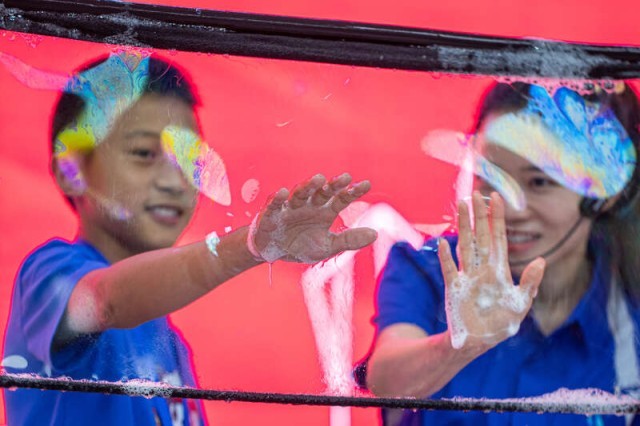 在《泡泡的科学“膜”力》科学秀上,四川科技馆的老师带领四川凉山的“山里娃”感受手穿肥皂膜。汪龙华/摄