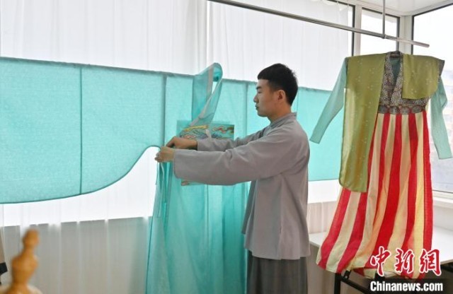 尹航说,近十年来他一直致力于汉服的制作与推广。为了在各种史料中收集汉服的资料和图片,他去过很多城市。张瑶 摄
