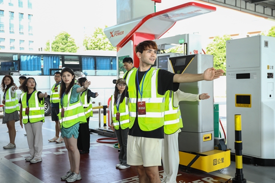 大学生在南京中和路加能站加油区体验加油服务。张伟/摄