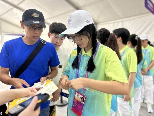 图二:浙江省杭州市淳安赛区场地志愿者提供检票服务。方笑 摄