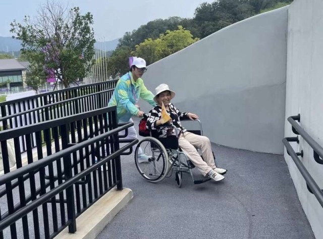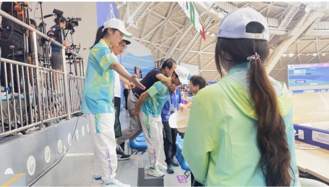 图二:浙江省杭州市淳安赛区场地志愿者给需要帮助的观众提供服务。方笑 摄