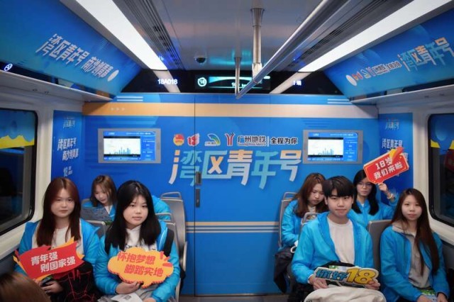 当天,在广州地铁18号线番禺广场站内,18号线“湾区青年号”专列上线运行,60名港澳青年代表作为“湾区青年号”的第一批乘客,获颁纪念票。“湾区青年号”列车车辆外观以“湾区蓝”为主色调,搭配金色线条点缀,呈现蓝色大海与金色海岸线的和谐呼应。车厢内随处可见以“18岁”为主题的各式装饰元素,展示着年轻人的活力与朝气。