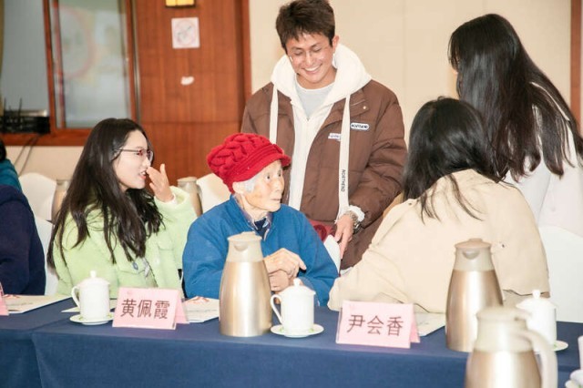4名“希望之星”与捐助者、90岁的黄佩霞奶奶聊天。