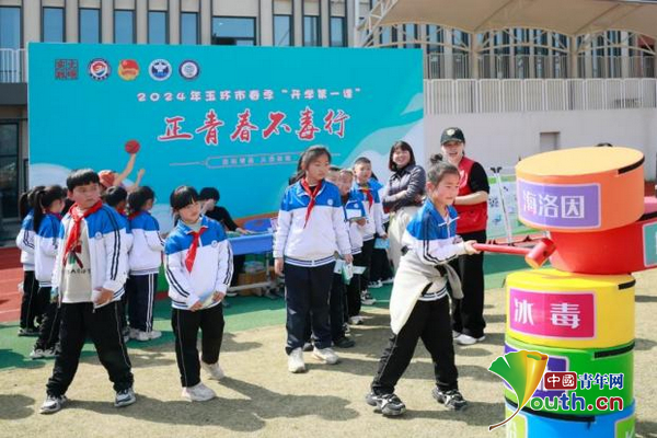 “灭火器要对准火苗根部喷。”“下车的时候我们如何正确开门呢?”近日,在浙江省玉环市陈屿中心小学榴榕路校区,270名小学生参加了“做自己的首席安全官”2024年玉环市春季“开学第一课”暨“三禁三防三自”教育活动。同学们观看无人机展示、警犬技术展示,并“沉浸式体验”交通安全、防范诈骗、禁毒、消防、急救、心理减压、性教育等8个游园体验活动,增强自我保护能力。