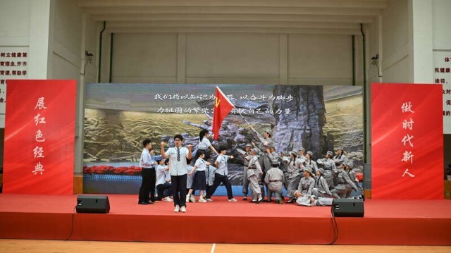 “好!我宣布‘复字32号’在今天被正式选为中华人民共和国国旗!”同学们饱含深情演绎的话剧《国旗》,讲述了中华人民共和国国旗诞生的故事。