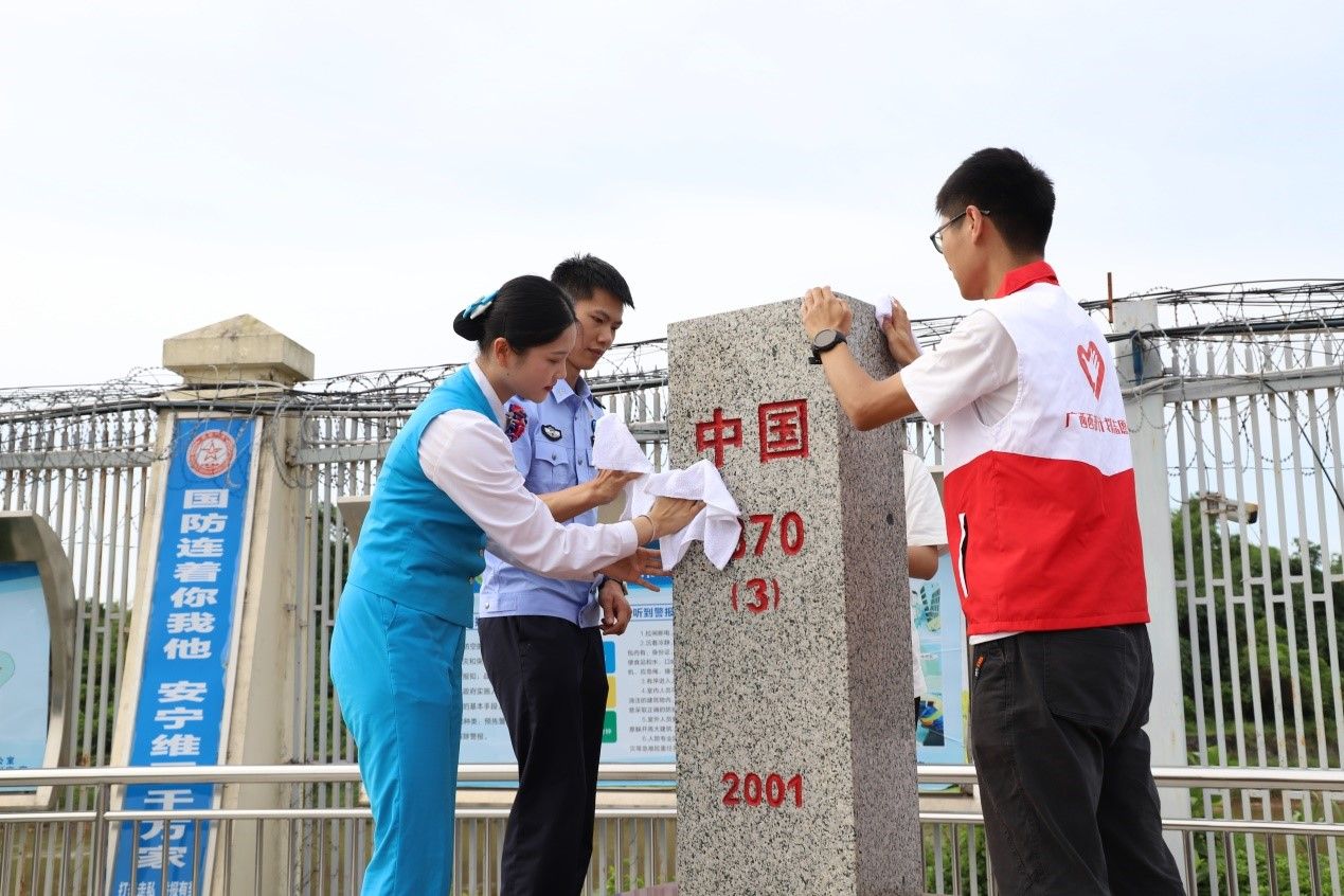 活动中,团员青年代表在中越边界1370(3)号界碑前庄严肃立,齐唱国歌,聆听东兴市外事办工作人员关于界碑的基本知识及重要意义的讲解,近距离感受祖国领土的神圣与威严,进一步坚定守边护边的决心。