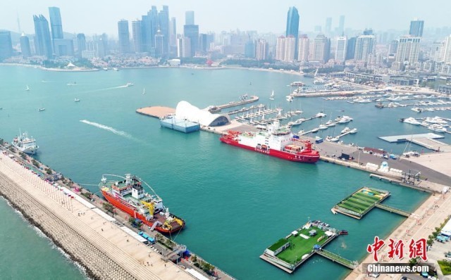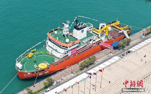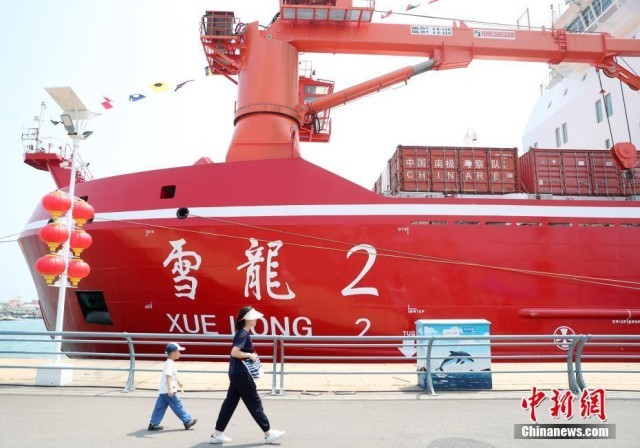 7月3日,“极地”号破冰调查船靠泊在山东省青岛市市南区奥帆中心码头。2024年是中国开展极地考察40周年,中国第14次北冰洋考察队暨“雪龙2”号、“极地”号即将启航出征。当日,“雪龙2”号、“极地”号向公众开放参观,为民众提供近距离感受中国极地科考大国重器的机会。(无人机照片)