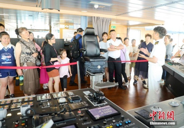 7月3日,山东青岛,公众在“雪龙2”号极地考察破冰船上参观。2024年是中国开展极地考察40周年,中国第14次北冰洋考察队暨“雪龙2”号、“极地”号即将启航出征。当日,“雪龙2”号、“极地”号向公众开放参观,为民众提供近距离感受中国极地科考大国重器的机会。