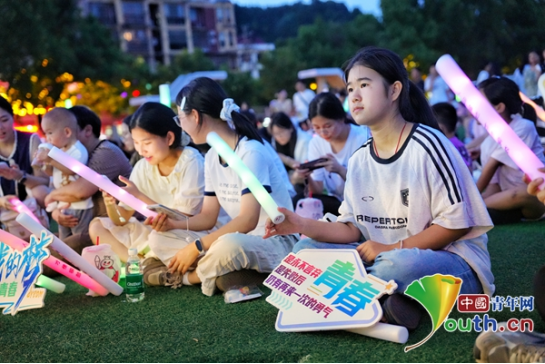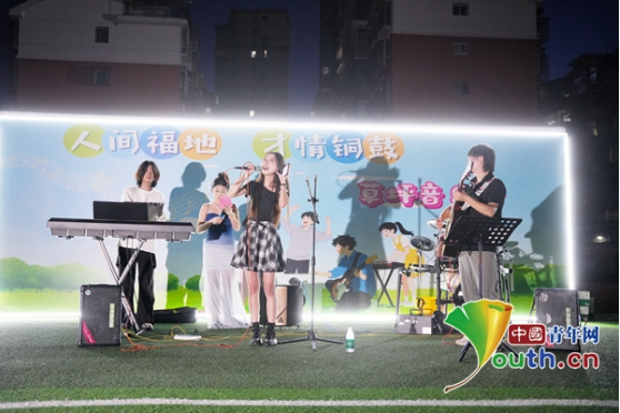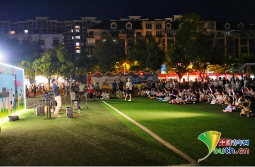 傍晚时分,夕阳的余晖洒在翠绿的草坪上,灯光渐次亮起,草坪音乐会正式拉开序幕。青年音乐爱好者和返乡大学生们或席地而坐,或随着音乐的节拍轻轻晃动,脸上洋溢着青春的笑容。
