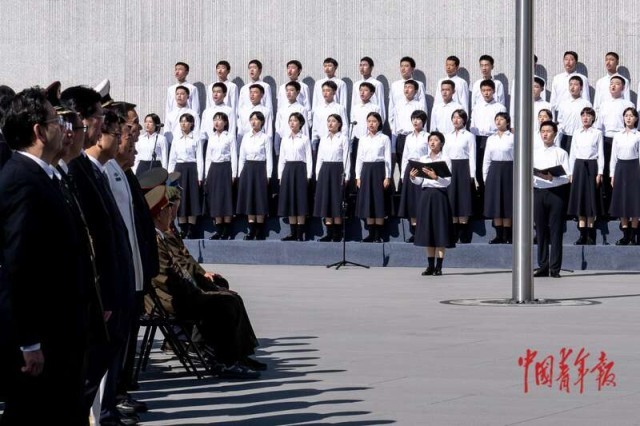 9月18日,辽宁省沈阳市,“九·一八”历史博物馆残历碑广场,来自沈阳的青年学生代表集体朗诵纪念杨靖宇、赵尚志、赵一曼等东北抗联英烈的诗词。中青报·中青网记者 李隽辉/摄