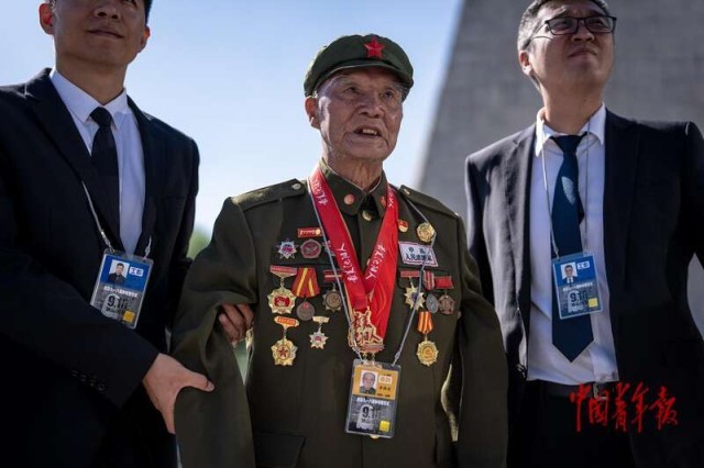9月18日,辽宁省沈阳市,“九·一八”历史博物馆残历碑广场,参加撞钟鸣警仪式的老兵代表——93岁的李维波。中青报·中青网记者 李隽辉/摄