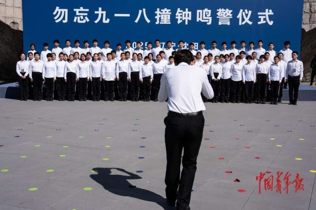 9月18日,辽宁省沈阳市,“九·一八”历史博物馆残历碑广场,撞钟鸣警仪式结束后,参加活动的合唱团学生合影留念。中青报·中青网记者 李隽辉/摄