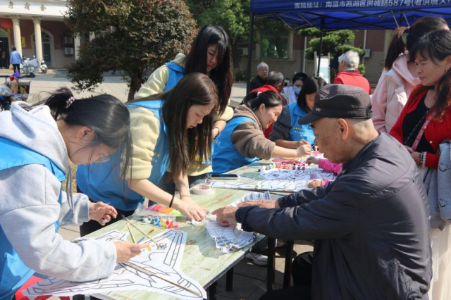 在“纸鸢寄情”代际共绘区里,社区老人与志愿者携手为素白纸鸢添彩,闲话家常间,不同世代的情感在色彩中交织,纸鸢化作承载记忆与祝福的温情载体。