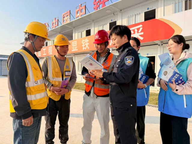 “工友们,秋冬季节天干物燥,工地里木材、保温材料多,私拉电线、违规动火这些行为可千万不能有!” 11月13日,安徽省合肥市长丰县下塘镇佳通工业园施工现场,一场以“消防月”为主题的安全宣传活动正在开展。塘镇应急消防站、派出所、团委、司法所、综治办等单位,联合中铁上海工程局新安徽佳通工业园项目部青年志愿者,用“理论+实操+答疑” 的形式,为一线工友送上了一堂干货满满的消防安全课。